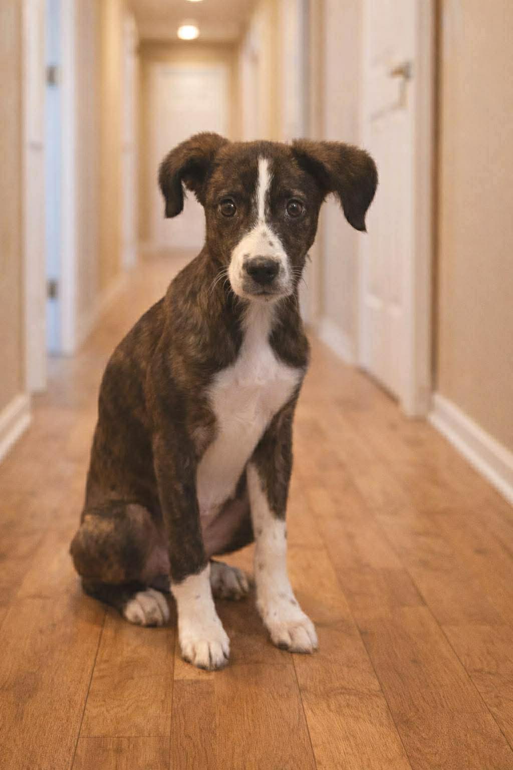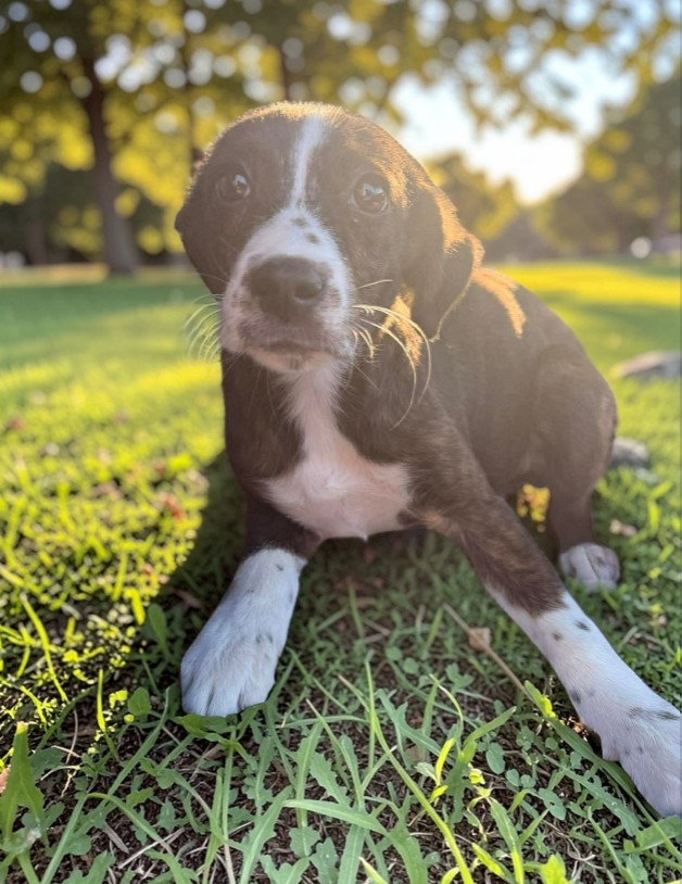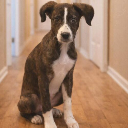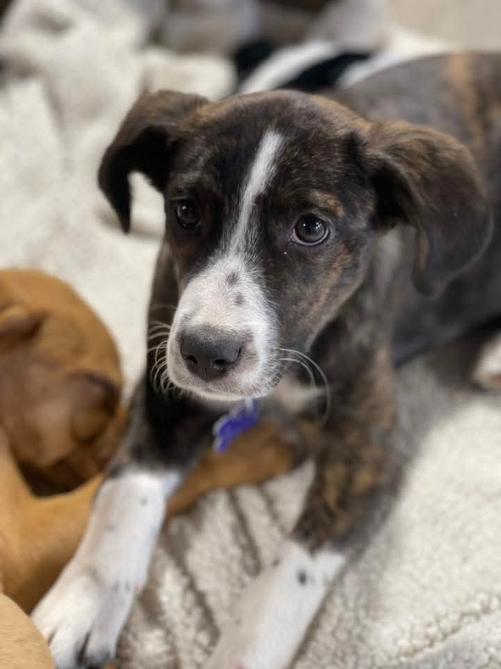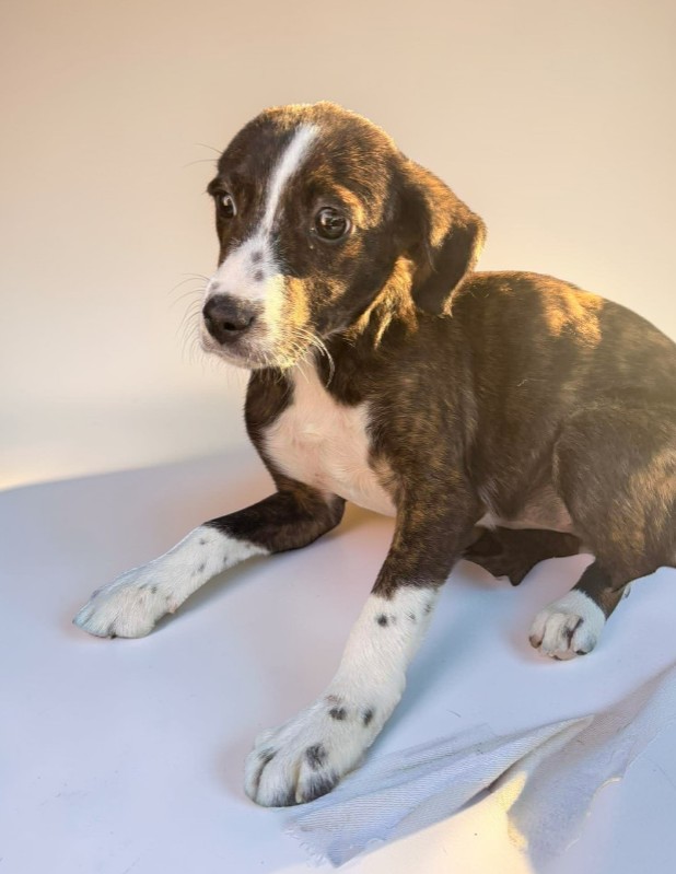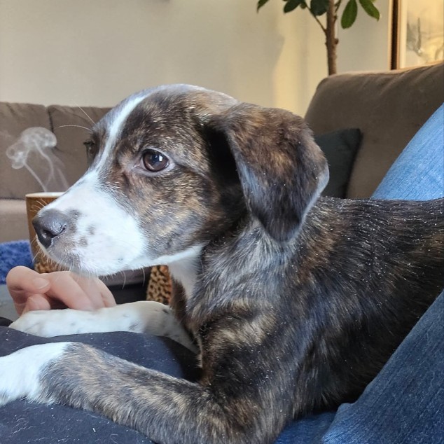 If you’ve ever wished for a quiet companion who simply wants to be near you, Becca is already volunteering. This reserved, elegant girl has soft brindle fur, soulful bedroom eyes, and a gentle presence that feels calming just to be around. Becca doesn’t demand the spotlight — she prefers to stay close, observing, loving, and quietly bonding with her person. She plays well with other dogs but can become overwhelmed in high-energy environments. While she enjoys companionship, she thrives in calmer settings where she doesn’t have to compete for attention. Her long, graceful tail and delicate features even hint that there may be a bit of greyhound in her background — though she’s officially a mystery mix. Becca weighed 17 pounds at 4 months old and is expected to grow into a lovely medium-sized companion. She’s currently working on housebreaking and leash training and responds well to gentle guidance.