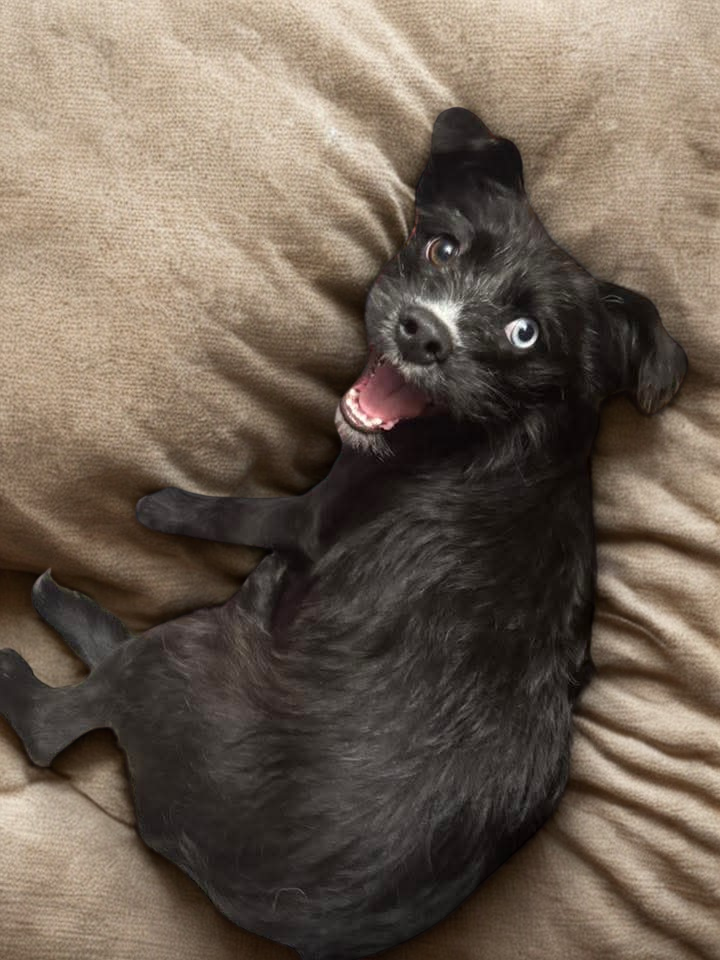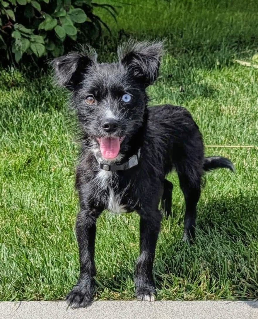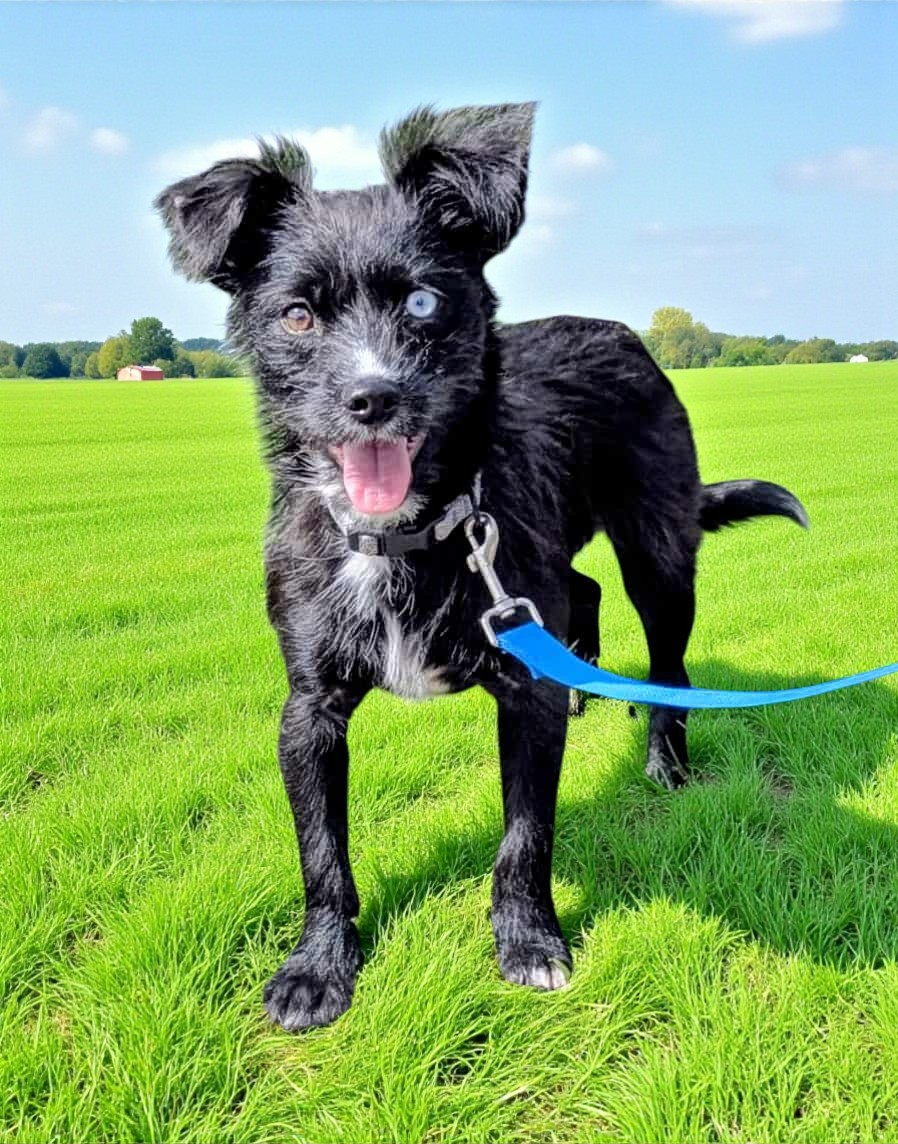Chrome is full of happy energy, curiosity, and goofy antics! He is so unique in every way, including his beautiful bi-colored eyes. He loves other dogs and would thrive with a canine playmate to help burn off his playful energy. He’s curious about cats, though not all cats are impressed with his enthusiasm (just ask the resident cat). He’s happiest on the move, whether that’s walking around the lake, exploring the yard, or romping with friends. He would love a secure fenced yard to safely stretch those little legs. While still working on house-training, Chrome is smart, quick to learn, and eager to please. Because of his bouncy energy, he’d do best with kids over 12 who can join in on the fun without being overwhelmed. If you’re ready for a loyal sidekick who promises cuddles, adventures, and plenty of laughs along the way, Chrome is waiting for you!