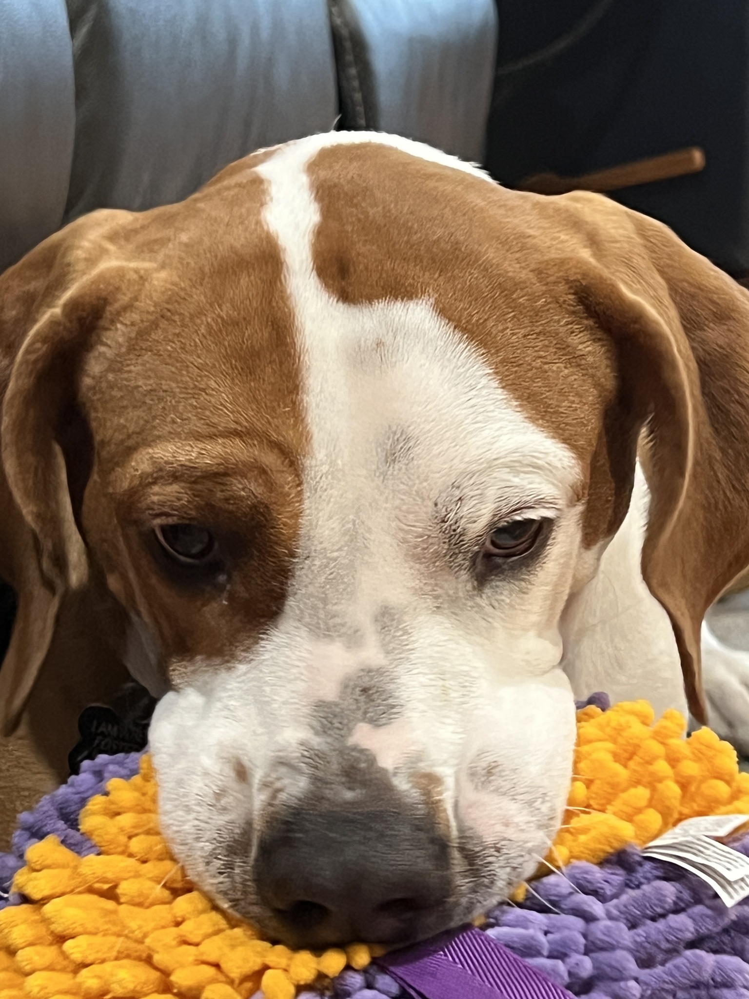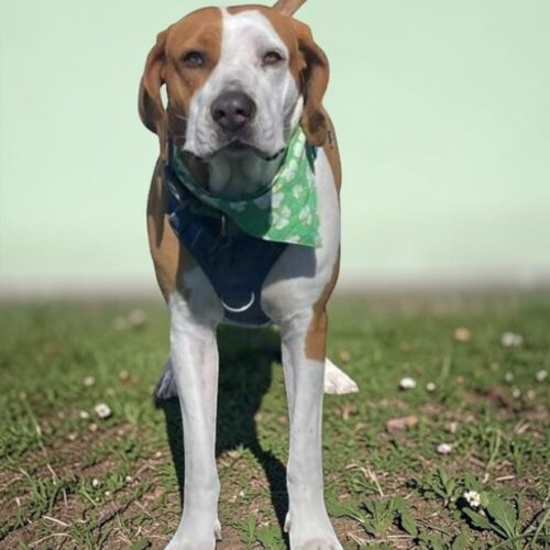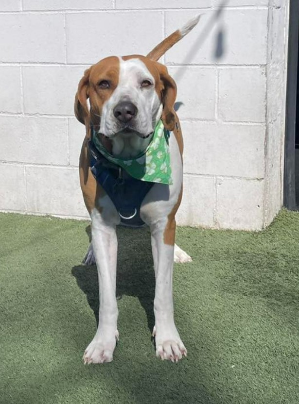 Rosie is a Foxhound who was was born approximately 6-01-23 and weighs 75 lbs. She is spayed, vaccinated, microchipped, given flea/tick preventative, dewormed. Rosie has completed heartworm treatment and must remain on monthly heartworm preventative (as all dogs should) and needs an adopter who will commit to being ontop of that for her. Adoption fee is $350 to help offset the many expenses we have for vetting costs. We rely strictly on adoption fees and donations to continue to save the lives of orphaned & abandoned pets; 100% goes towards their care.