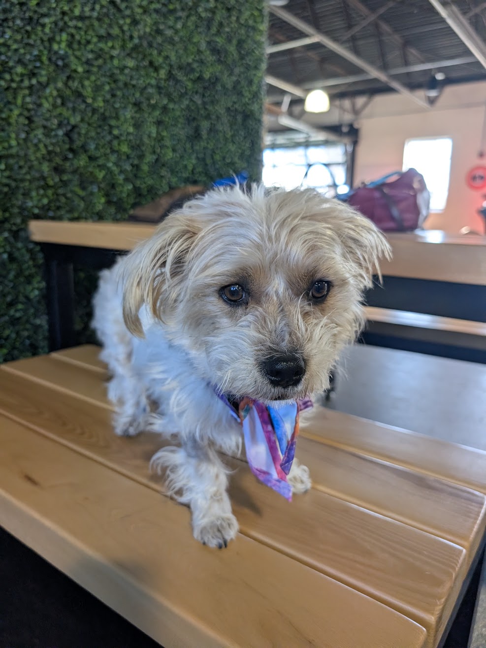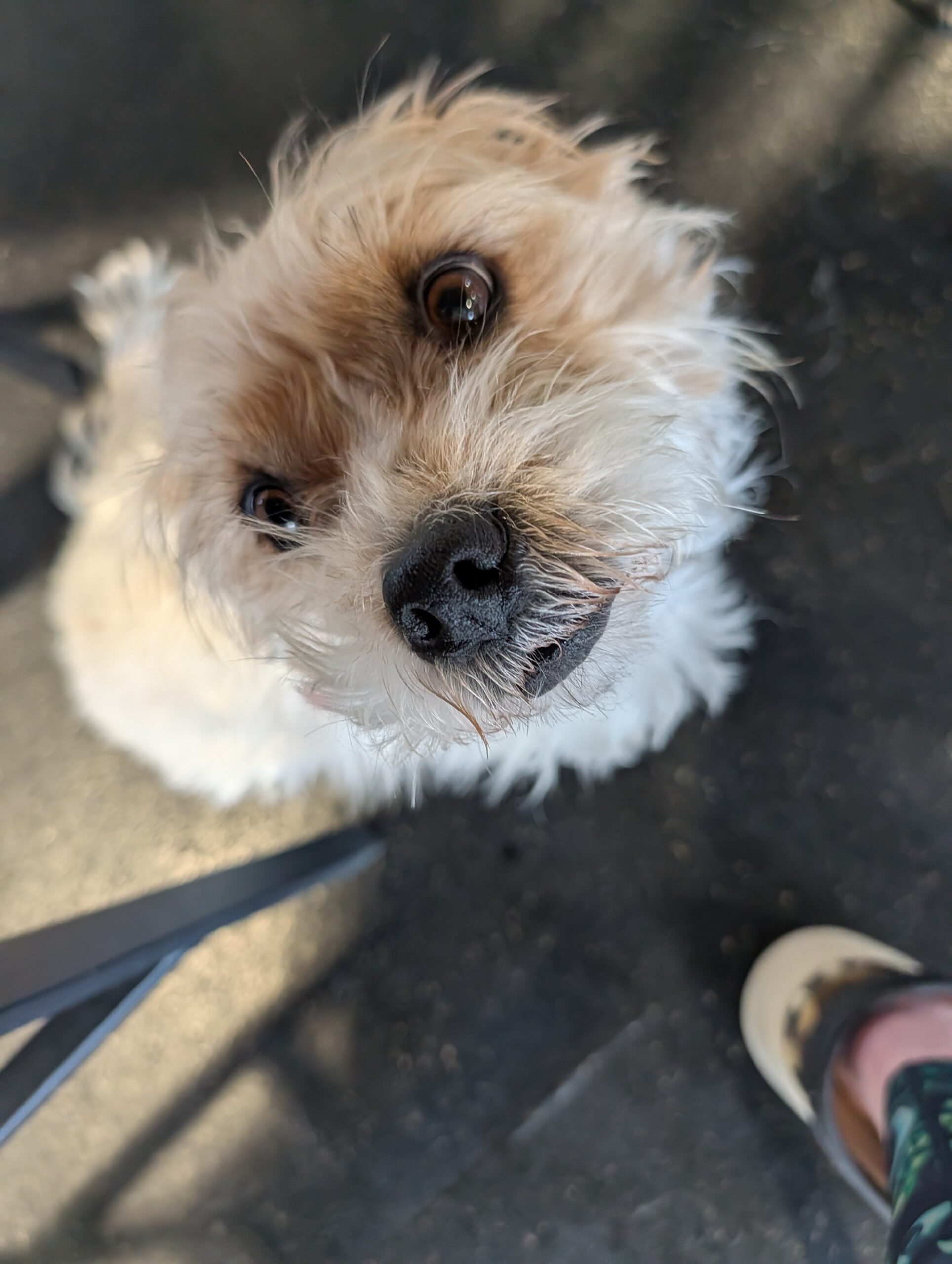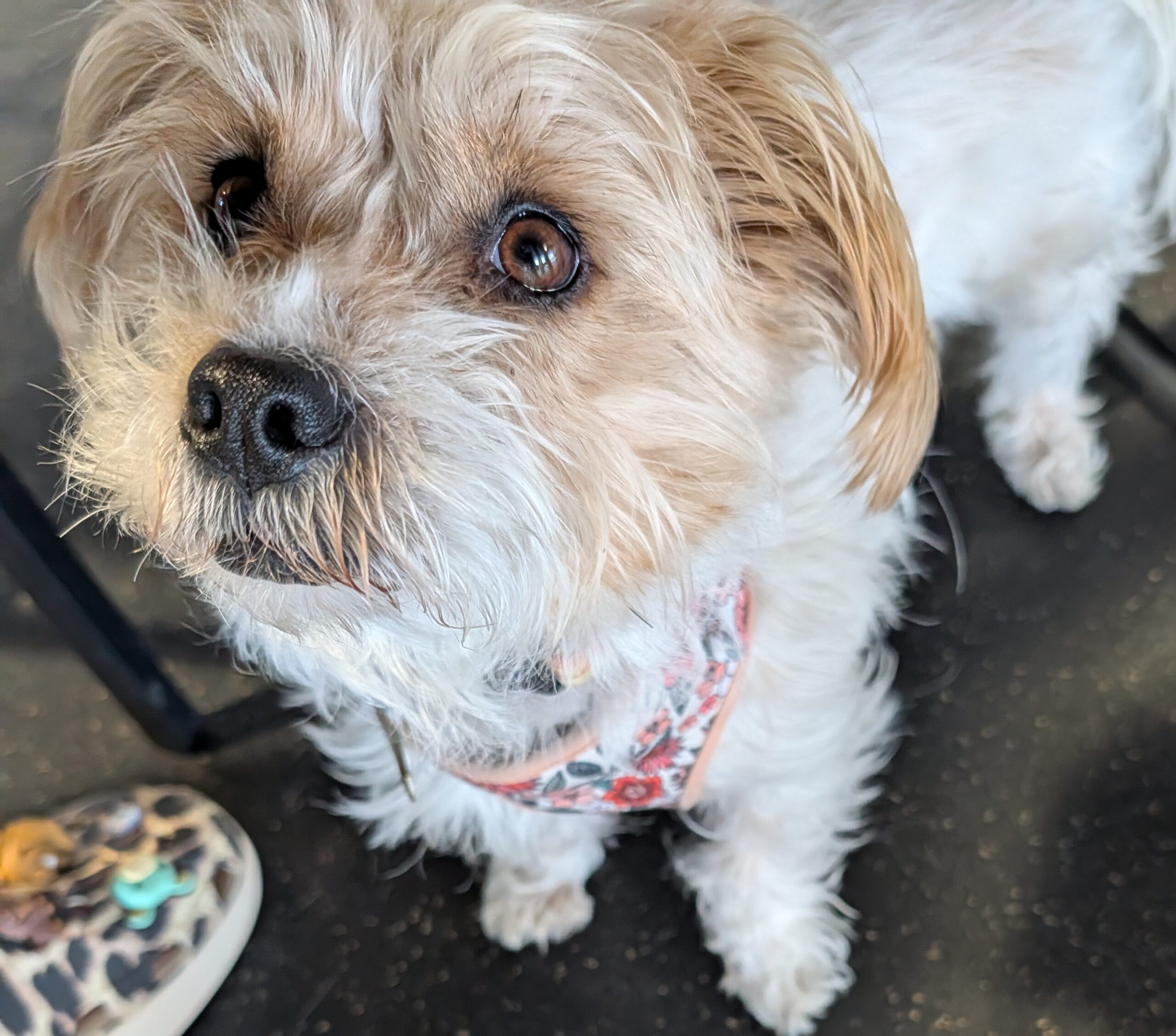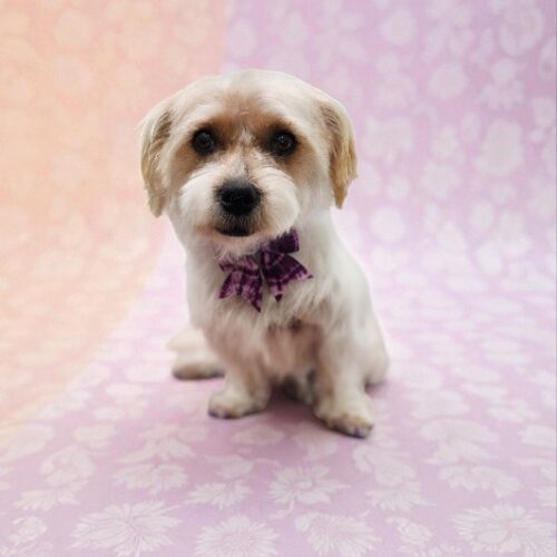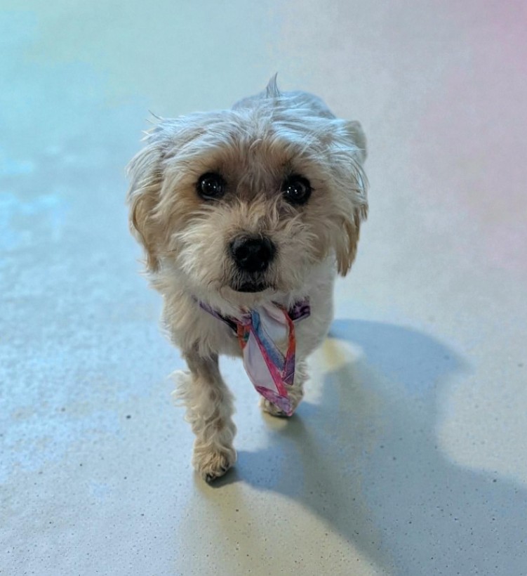 Snowy (also known as “Betty White,” thanks to her all-natural glamorous bottle-blonde coat and those adorable darker roots) is a playful, inquisitive 2-year-old Havanese/Shih Tzu/West Highland terrier mix who’s ready to be your best little sidekick. She’s the kind of dog who doesn’t need to be glued to your lap 24/7—but she absolutely wants to be nearby, keeping you company like a loyal friend, confidant, and tiny roommate who always knows what you’re up to. She is much smaller than her photos reflect. True to her nickname, Snowy gives major St. Olaf energy: sweet, charming, a little quirky, and impossible not to love. She adores other dogs and would thrive with a canine companion to wrestle, romp, and share adventures with, and she also enjoys her toys and a good play session. When she decides it’s cuddle time, she’ll happily curl up with you, but she also has a wonderful independent streak that makes her an easy, balanced companion. She will go into a crate, though she’s not especially fond of it if everyone else is free-roaming, so she’ll do best with a patient adopter who can help her feel secure. With her playful spirit, gentle affection, and Golden-Girl-level charm, Snowy is ready to find her forever home—preferably one with a dog friend and someone who appreciates a little Betty White magic.