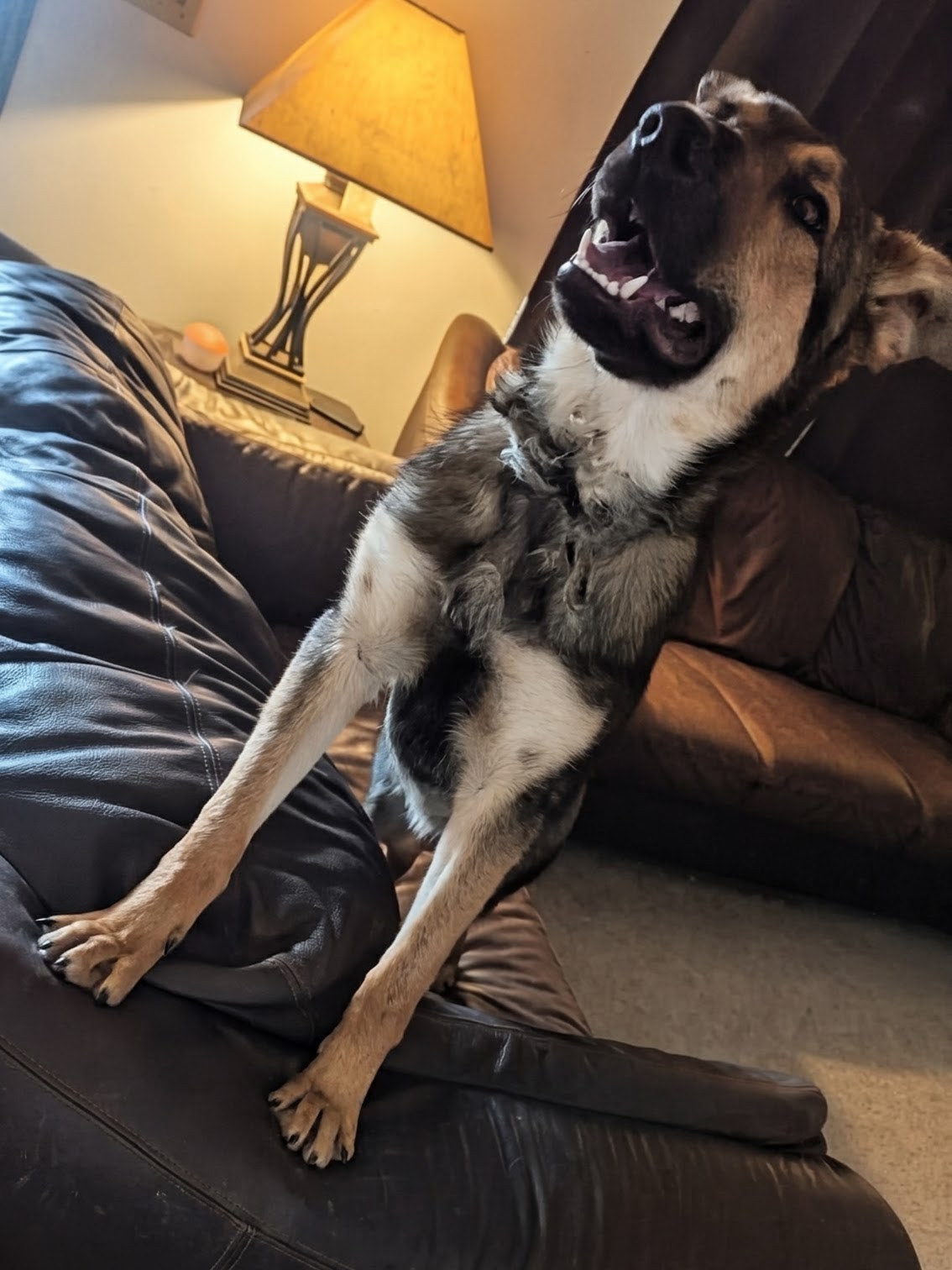 Trey is a big baby in every sense of the word—big body, big heart, and an even bigger personality that’s still growing. Fostered alongside a whole herd of doxies and three corgi mix pups, Trey plays nonstop but is impressively gentle, never too rough and always mindful of his smaller friends. He’s doing great with potty training and only has accidents when playtime is simply too exciting to pause. Curious and goofy, Trey has a very specific obsession with toilet paper and will somehow always manage to find a roll. He’s learning to wear a harness but is still unsure about it, and he can’t currently wear a collar while his neck finishes healing, which means a fenced yard is needed until leash training is fully introduced. Trey loves people, has no idea how big he is, and firmly believes your lap is exactly where he belongs. He knows how to sit, is learning to shake, loves riding in the truck, and is absolutely ready to be someone’s loyal sidekick and best adventure buddy. Not cat tested yet, but it’s unlikely to be an issue.